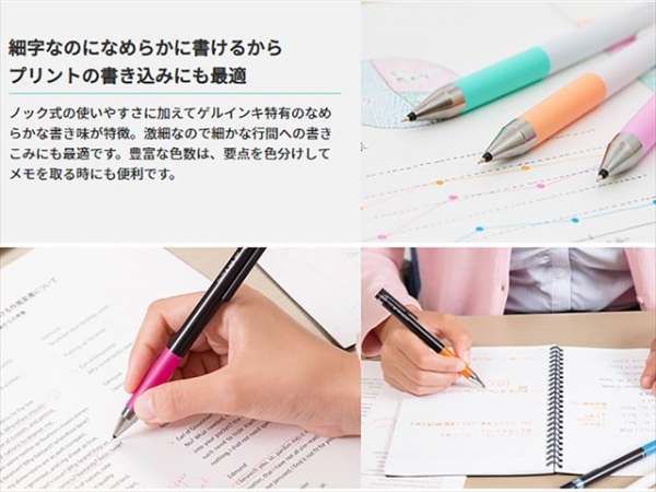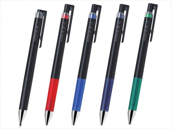 鮮やかな発色とスムーズな描き心地が好評の水性顔料ゲルインキボールペン スタイリッシュなブラックボディでノック式。新開発のペン先と、新顔料ゲルインキによる濃くなめらかな書き味が特徴です。勉強に、ビジネスに、様々な筆記シーンを鮮やかに彩ります。