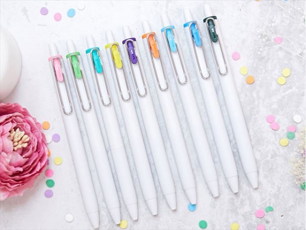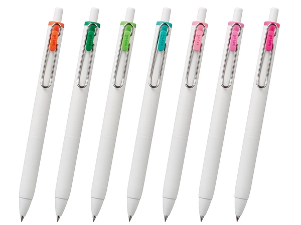 三菱鉛筆と立命館大学の共同研究により、黒色に関して「濃く」「くっきり」とした文字ほど記憶に残りやすいことがわかりました。一般的なゲルインクと比べて、黒は一層濃く、カラーはより鮮やか発色し、記憶に残りやすい文字が書ける「ユニボールワン」は、ノートへの筆記などが多い学業シーンのノベルティボールペンにぜひおすすめしたい名入れボールペンです。 赤シートで隠せるインク色もラインアップ 記憶学習に臨む方向けには、0.38mmでは、オレンジ、ベビーピンク、イエローの3色が暗記用赤シートで隠すことができます。