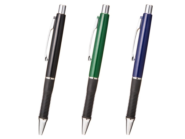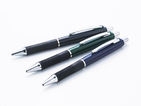 メタルポイントボールペンはシックでハイセンスなカラーリングとシルバー塗装が施されたクリップやノックパーツなどで高級を演出するボールペンです。また、ペン先グリップのくびれが指をしっかりホールドしてくれ書きやすい機能性も持った高級感あふれるボールペンです。ハイセンスな落ち着いたカラーリングのボールペンだからノベルティや粗品などで配られるシーンを問わずお使いいただる名入れボールペンです。