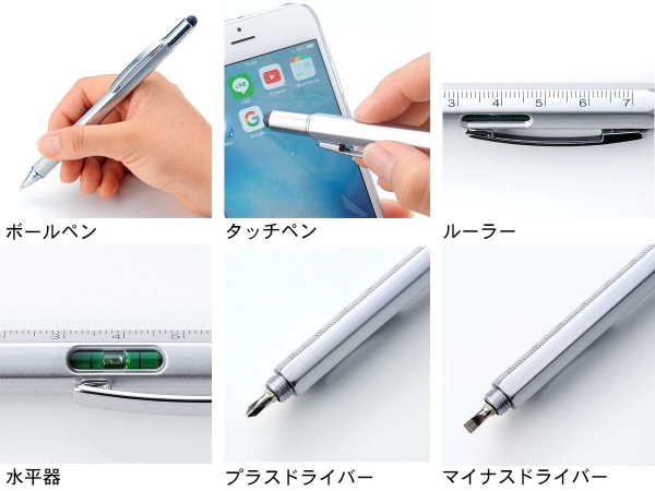 1本のボールペンに「ボールペン」「タッチペン」「ルーラー」「水平器」「ドライバー」の5機能を集約した多機能マルチツールボールペンです。