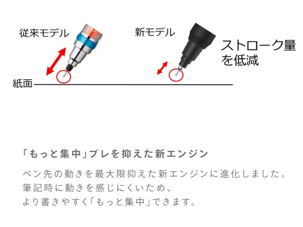 芯が均一に摩耗してトガり続けます。 ずっと細い文字を書き続けられるので、 ノートもすっきりします。 更に筆記時のブレを抑えた新設計・新エンジン搭載。 エラストマーグリップ搭載でより書きやすく進化しました。
