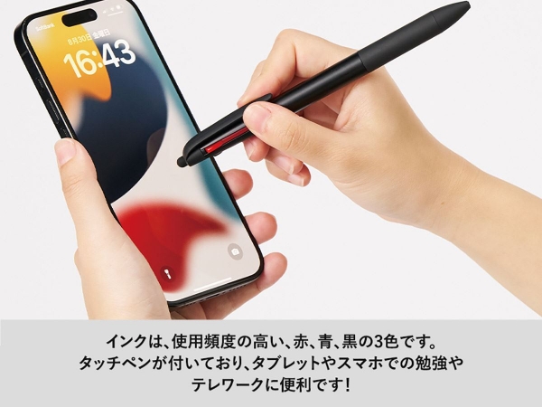 再生ABSを使用したタッチペン付き3色ボールペンです。 多色ボールペンながら、スリムで無駄のないシンプルなデザインです。 見た目のスタイリッシュさはもちろん、持ち運びにも適しています。 カラーはノベルティや記念品として需要の高い、シルバー・ホワイト・ネイビー・ブラック・レッドの5色展開です。 またタッチペン付き・多色ボールペンの機能性のなか低単価なので、幅広い案件におすすめです。 タッチペン付きなので、タブレット端末を使用する企業の備品や、オープンキャンパスのノベルティとして使用すれば実用的な商品としてご提案できます。