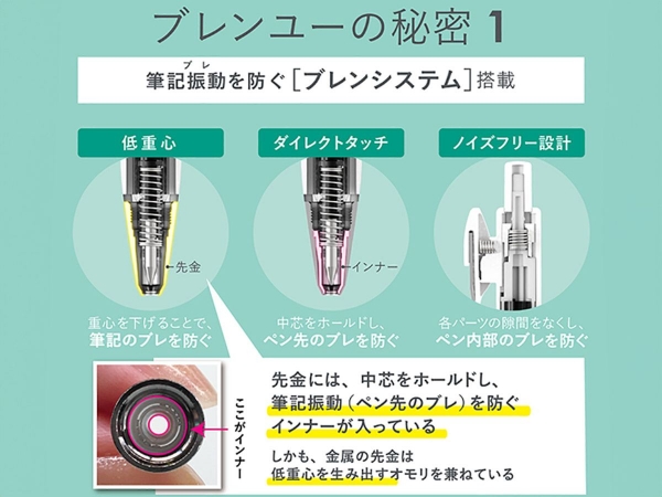 筆記時の振動を制御するため、「ブレンシステム」機構を採用。 ・ノイズフリー設計 各パーツの隙間をなくして、ペン内部のブレを防ぎます。 ・低重心 金属製の先端で重心を下げ、筆記のブレを防ぎます。 ・ダイレクトタッチ 先端に中芯をホールドするインナーパーツを搭載し、ペン先のブレを防ぎます。