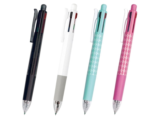 サラサマルチは、なめらかジェルインク搭載の「サラサ」シリーズに、1本で黒、赤、青、緑の4色ボールペンとシャープペンの5機能が使用できる多機能ペンです。ペンの先端は光の屈折効果でインク汚れが目立ちにくいガラス細工のように美しいデザインです。また、軸には可愛いアーガイル柄が施されており、機能性に加えてデザイン性にもこだわった女性や学生におすすめの1本です。