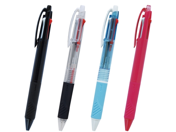 ジェットストリーム3&1 多機能ペンは「濃くなめらかに書ける」ジェットストリームインクの黒、赤、青の3色ボールペンにシャープペン機能を搭載した便利な多機能ペンです。「デザイン性」「機能性」を兼ね備えて人気の多機能ペンは、記念品や学業シーンなどの様々なノベルティシーンで人気の名入れボールペンです。本体色は人気が高い黒軸の透明ブラック、使われる方の利便性が高まる透明、水色、女性の方をターゲットにしたノベルティにおすすめのローズピンクの全4色から選べます。