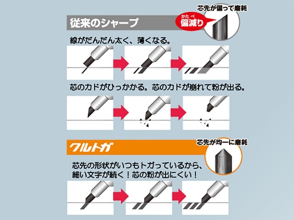 ・クルっと回ってトガった芯をキープします。細く、クッキリ書き続けられるシャープです。 ・クルトガは芯先の形状がいつもトガっているから、細い文字が続きます。また、芯の粉が出にくいです。 ・ペン先の動きを最大限抑えた新エンジンに進化しました。 筆記時に動きを感じにくいため、より書きやすく「もっと集中」できます。 ・「もっと握りやすく」エラストマーグリップ搭載 もっとたくさん勉強する人のためにグリップを搭載しています。 ペン先側が広がっている形状にすることで、指が引っかかりやすく、持ちやすい。指が痛くなりにくい最適設計です。 ・「もっとシンプル」学びに寄り添う新デザイン シンプルで毎日の勉強に使いやすいワントーンなデザインで勉強により集中出来る1本に仕上げました。