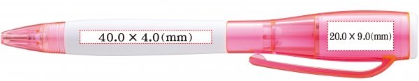 LEDライト付きボールペン本体軸(ペン先白軸部分)とペン先のLEDライト(ソケット部分)の2カ所に印刷が可能です。 LEDライト部分は20×9mmのサイズで名入れが可能なのでロゴマークやキャラクターなど印刷に最適です。