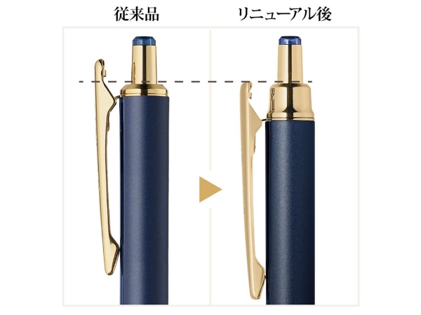 高級感のあるデザインで、ビンテージカラーインクを搭載したボールペン。 ビンテージカラーは、ブルーブラックやブラウングレーなど万年筆のインクのように落ち着いたシックな色合いです。文字書きでもくっきり見える色ながら、黒とは違ったやさしい雰囲気で、ちょっとした個性の演出ができます。 より手帳に使いやすくなるよう、前回モデルより軽量化するなど設計とデザインをリニューアルしました。
