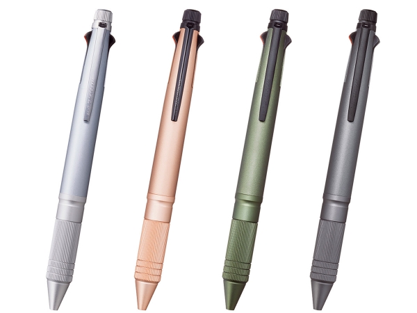 ジェットストリーム 4&1の魅力である“タフ”“操作性”“洗練されたデザイン”をアルミ素材の採用により、使いやすさ、デザインとも進化させました。先軸にアルミ素材を採用しながらビジネスシーンに合った落ち着いた配色とし、グリップ部は、握りやすいローレット加工を施しています。消しゴムキャップにもアルミ素材を採用し、ローレット加工を施すことにより、上質なデザイン性と操作性を両立させています。