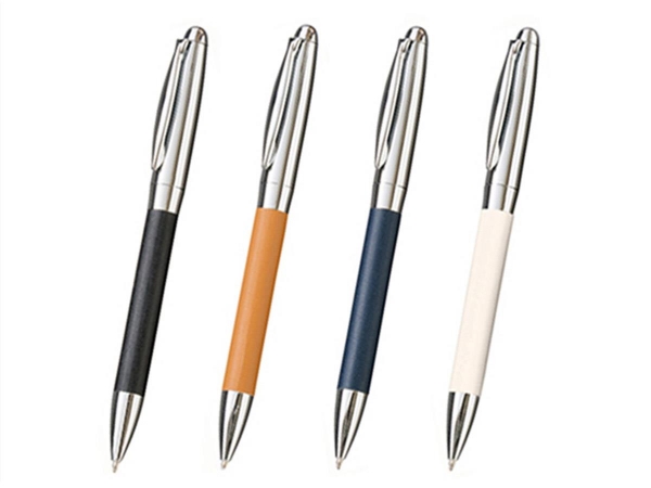 レザー風素材を使用しているオシャレで美しいボールペンです。本体色は4色からお選びできギフト感あるパッケージ入り。