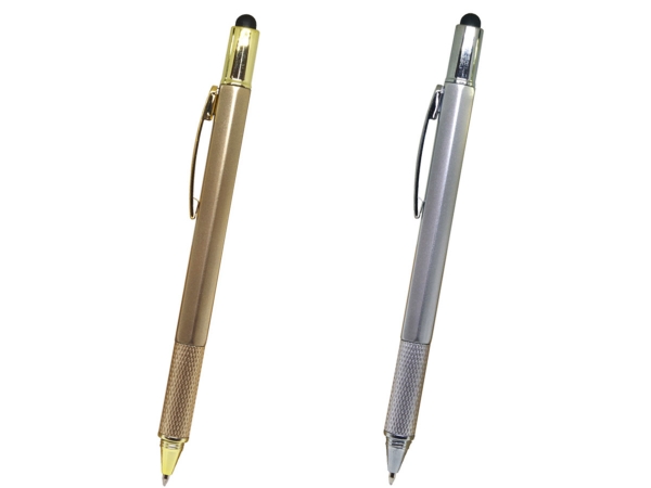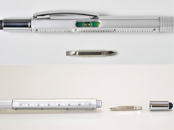 5in1ボールペンは、「ボールペン」「タッチペン」「ドライバー」「水平器」「70mmスケール」のご機能を1本に備えた便利なボールペンです。機能性から「ものづくりイベント」などのノベルティや建築業界や不動産業界などの粗品におすすめの名入れボールペンです。