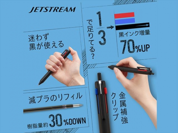 よく使う黒インクのインク量が約70%増量!! 『長持ちリフィル』を搭載したジェットストリーム新3色ボールペンが新登場!!