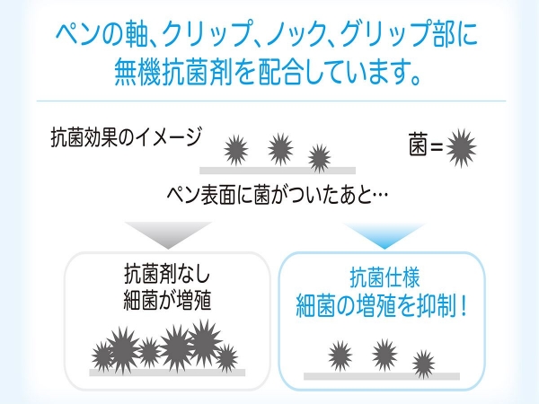 菌を長時間増やさないようにすることを指し、菌を一時的に「死滅・除去」する殺菌・除菌とは異なります。 (注意:抗ウイルス商品ではございません) ・JIS Z 2801に準じて行われた試験(抗菌加工されていない製品の表面と比較し、細菌の増殖割合が百分の一以下であること。 ・試験に用いる細菌は黄色ブドウ球菌および大腸菌)をクリアした材料を採用しています(内部パーツ・レフィルを除く) ※抗菌効果はありますが、ウイルスへの効果が確認されたものではありません。 【抗菌の特長が発揮されるシーン】 ・病院 病院は衛生的な場所。抗菌仕様なら清潔で安心。 ・飲食店 抗菌仕様は、清潔さが求められる飲食店やキッチンに最適。 ・公共の場 駅や役所、銀行など様々な人が利用する場所では、不特定多数の人がいろいろな書き方をするから抗菌仕様なら清潔感・安心感があります。