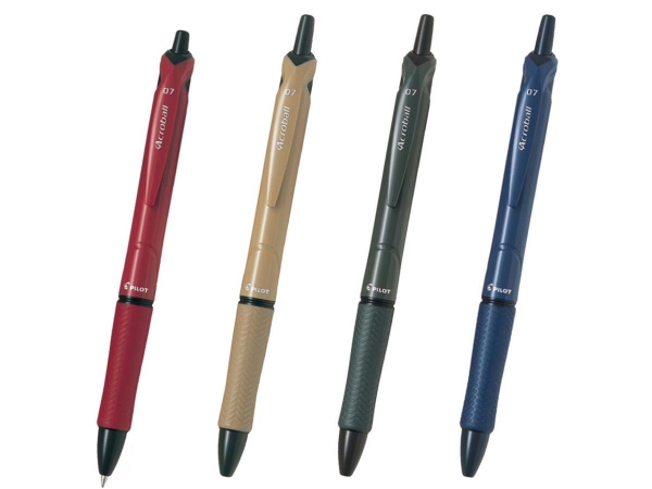 ・油性インクに比べ約約1/5のインキ粘土のアクロインキ搭載 ・潤滑剤を配合し、ペン先でのボールの摩擦抵抗を低減することで回転がスムーズ になり、なめらかで濃い筆跡を実現!! ・グリップが手に馴染んで握りやすいボールペンです。 ・渋くてお洒落な色合いの4色で、ビジネスマンにピッタリのボールペン