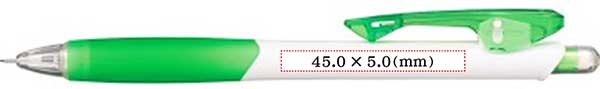 名入れ可能範囲は最大45.0×5.0mmとなりますが、印刷可能範囲全面に天地(上下)5.0mmで印刷しますと 軸の細い部分の名入れが多少歪む事がありますので、その場合は天地4.5mmくらいを目安に作成いただくのがお勧めです。