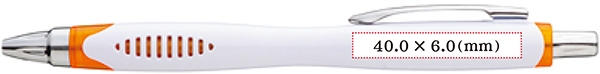 軸の中央からペン先に向けて形状が細くなりますので、印刷サイズのワイド(左右)を40.0mmとさせていただいております。 名入れ可能範囲は最大40.0×6.0mmとなりますが、印刷可能範囲全面に天地(上下)6.0mmで印刷しますと 名入れが多少歪む事がありますので、その場合は天地5.5mmくらいを目安に作成いただくのがお勧めです。 名入れ位置の向かって左側の部分は軸が細いので、天地(上下)を6.0mm使うような細かいロゴは、 より綺麗に名入れが映える中央から向かって右側への配置をお勧めしております。