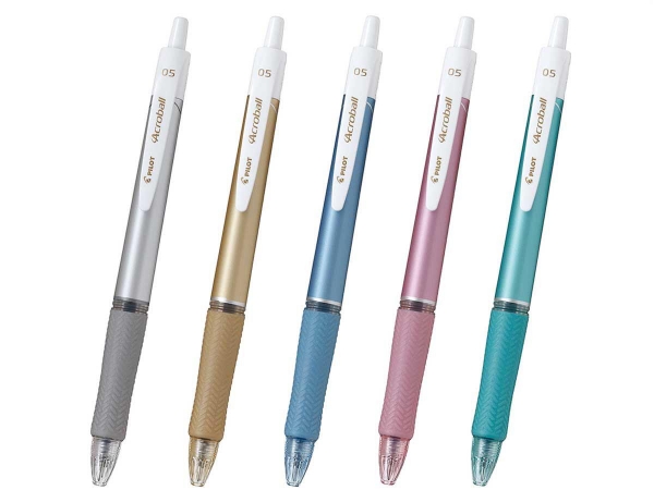 ・なめらかな書き味とカスレのない書き出しが特長の低粘度油性インキ「アクロインキ」を採用しました。 ・ボディにはメタル調の転写加工を施し、輝きのあるファッション性の高いデザインに仕上げました。0.5mmの極細タイプ ボディカラー計5色をラインナップしました。 ・グリップ部分には、低粘度インキでも筆記をコントロールしやすいように、やわらかく滑りにくい材質のラバーにタイヤパターンを施した「タイヤパターングリップ」を採用しました。極細タイプはボディと同系色のグリップカラーです。
