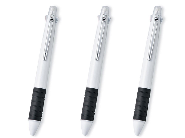・利用頻度の高い0.7mmと0.5mmの黒インクを2本搭載 ・黒・赤・青インク+シャープペン付きの多機能ペン ・ペン後端に消しゴム付き ・名入れが際立つフルカラー印刷対応商品 ・最安価格 135.3円から 名入れ・版代・送料無料 ・最小ロット 50本から作成