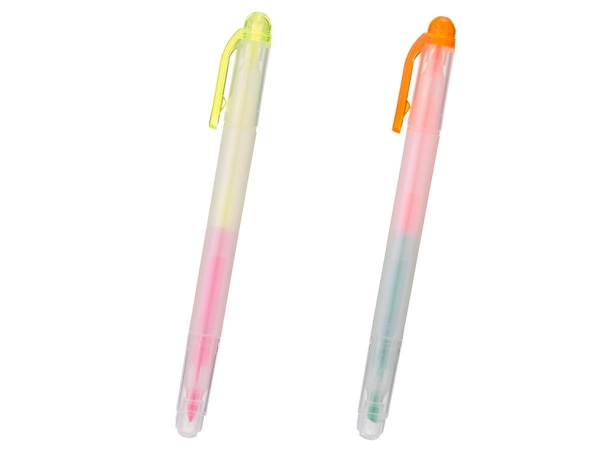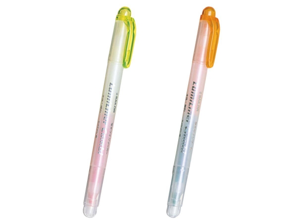 ルミライナーコンビは1本で2色使える両頭タイプの蛍光マーカーです。インクの濃度を従来より濃くし、より鮮やかな発色を実現。チップは平形芯を採用。「イエロー&ピンク」と「オレンジ&グリーン」の2タイプのインクバリエーションになっています。