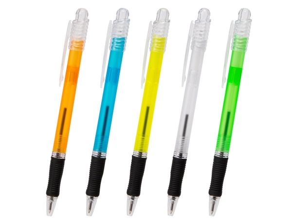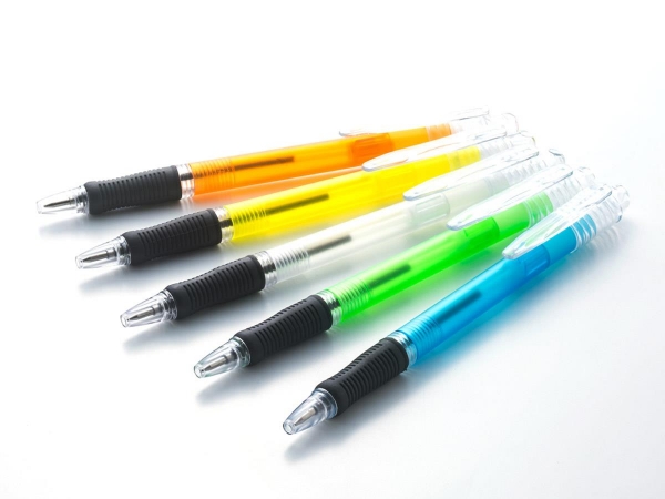 色鮮やかな5色の落ち着いた梨地加工の半透明ボディに、おしゃれなスクリューデザインのノック棒がポイント。汚れ防止の引きしまった黒ラバーグリップ付きで疲れにくくて書きやすいクリスタルスクリューボールペンです。