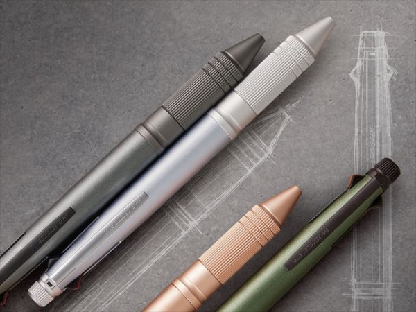 ジェットストリーム 4&1の魅力である“タフ”“操作性”“洗練されたデザイン”をアルミ素材の採用により、使いやすさ、デザインとも進化させました。先軸にアルミ素材を採用しながらビジネスシーンに合った落ち着いた配色とし、グリップ部は、握りやすいローレット加工を施しています。消しゴムキャップにもアルミ素材を採用し、ローレット加工を施すことにより、上質なデザイン性と操作性を両立させています。
