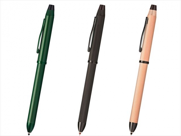 キャップを回転させて黒と赤のボールペンと0.5mmのペンシルを切り替えられる複合ペン、テックスリー。CROSSブランドを象徴するコニカルトップを施した高級感のあるシルエットはビジネスシーンにもマッチします。スクリュー式のキャップトップ内にペンシル用消しゴムを内蔵、別売のスタイラスパーツを使うことで、タッチスクリーンの操作がスムーズに行えます。