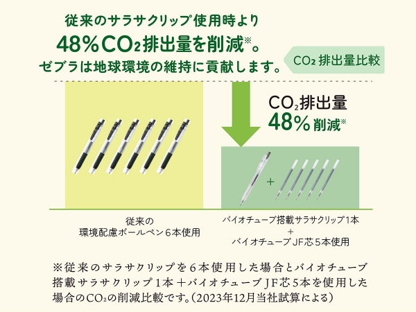 環境に配慮したサラサクリップが新登場! ・芯とグリップにサトウキビ由来のバイオマスプラスチックを使用!! ・従来の芯よりCO2の排出量を48%削減したBIOTUBE搭載! ・昨今、ノベルティも地球に優しい商品の注目度が高いのでお勧め!