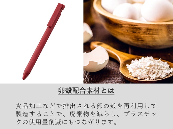 卵の殻を素材に使用したエコボールペンです。 新たな資源を使用せずに既存の素材を有効活用することができ、天然の素材である卵の殻を使用することで、リサイクルや再生もしやすく環境への影響を軽減できます。 本体色はシンプルで名入れがしやすいホワイト、ブラック、ネイビーに加え、深みのあるレッドまで4色展開でご用意しています。