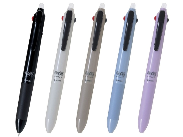 「消せる安心」+「消えない自信」をこの1本で。 通常のスライドレバーにFRIXIONインキ3色(黒/赤/青)、クリップスライドレバーに油性インキ(黒)を搭載しているボールペンです。