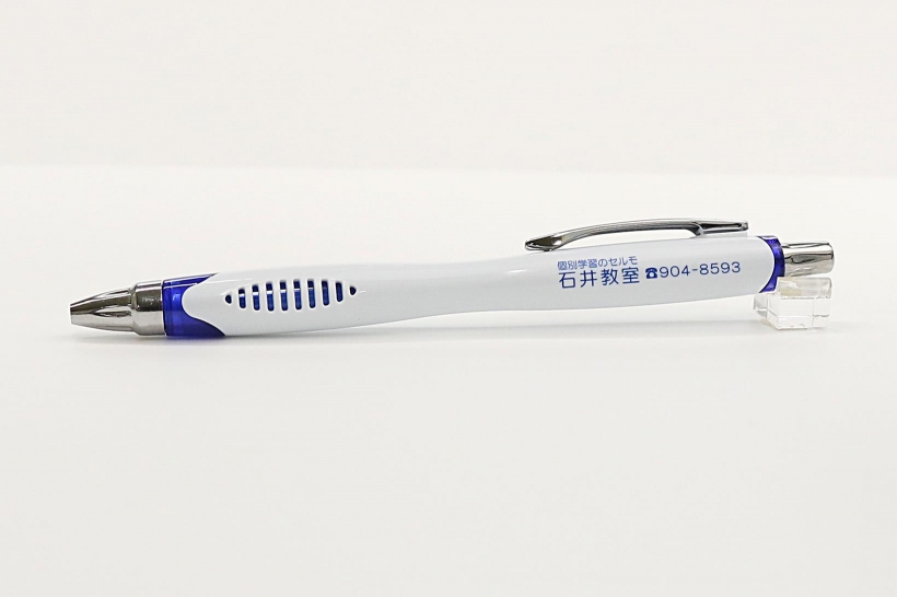 こちらのホワイトビーナスボールペンに青名入れで印刷した制作実績を掲載させていただきます。